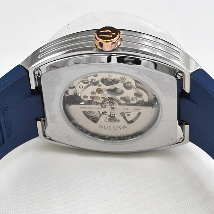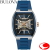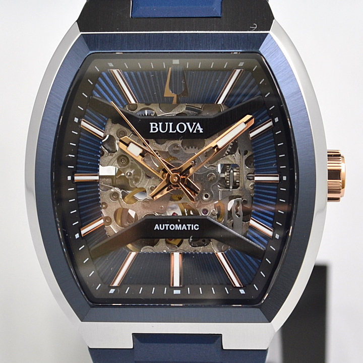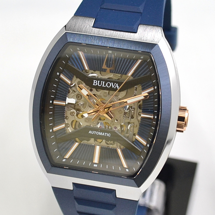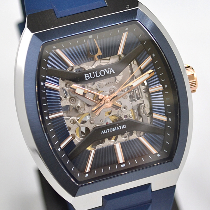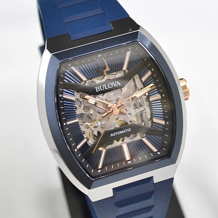 個性ある大人な雰囲気が際立つクラシックコレクションのスケルトン文字盤のトノーケースモデル。ブリッジにはサンレイ装飾を施し、ムーブメントパーツ仕上げにもこだわりました。ガラスとケースは緩やかにカーブ、ケースはヘアラインを施すことで、文字盤の大胆さをより際立つメリハリの効いたデザインです。文字盤やベゼルに合わせたネイビーのラバーストラップが大人らしいモダンスポーティーウォッチです。