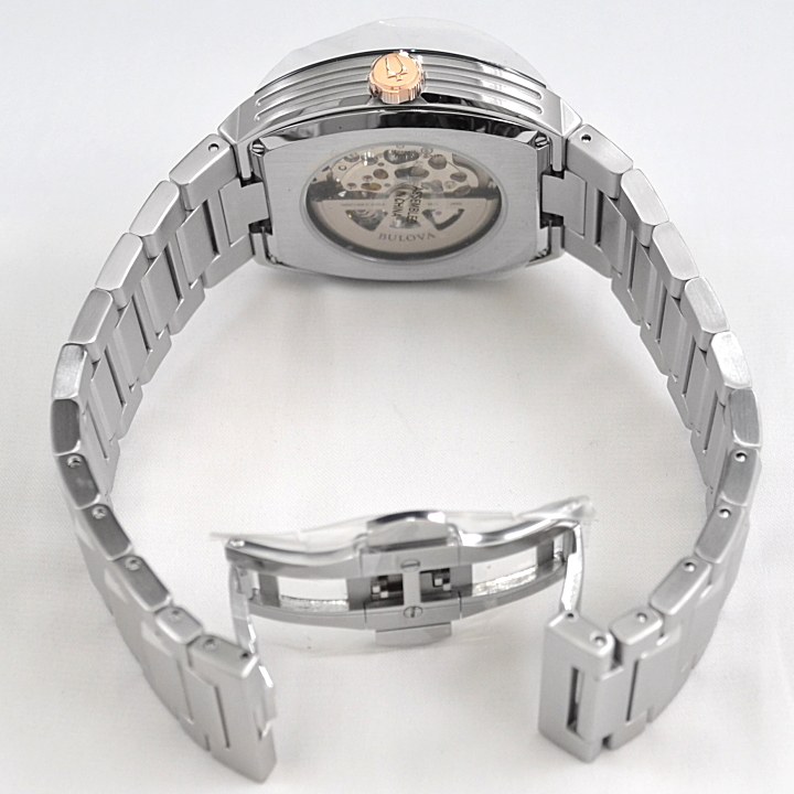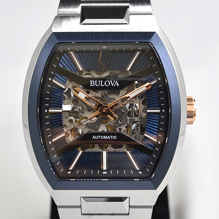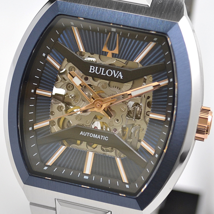 個性ある大人な雰囲気が際立つクラシックコレクションのスケルトン文字盤のトノーケースモデル。ブリッジにはサンレイ装飾を施し、ムーブメントパーツ仕上げにもこだわりました。ガラスとケースは緩やかにカーブ、ケースはヘアラインを施すことで、文字盤の大胆さをより際立つメリハリの効いたデザインです。